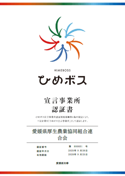 愛媛県より女性活躍及び仕事と家庭生活等の両立に取り組む事業所を認証する「ひめボス宣言事業所」に認証されました。